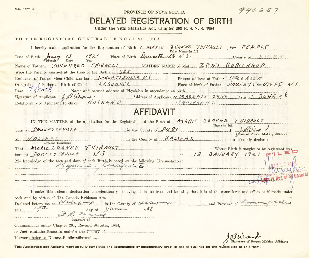 I hereby make application for the Registration of Birth of Marie JeanneThibault Sex Female