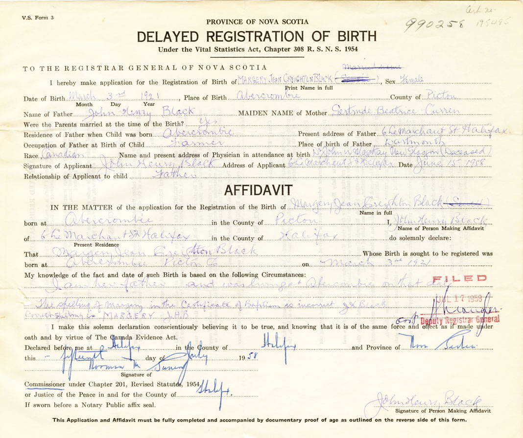 IN THE MATTER of the application for the Registration of the Birth of Margery Jean CreightonBlack