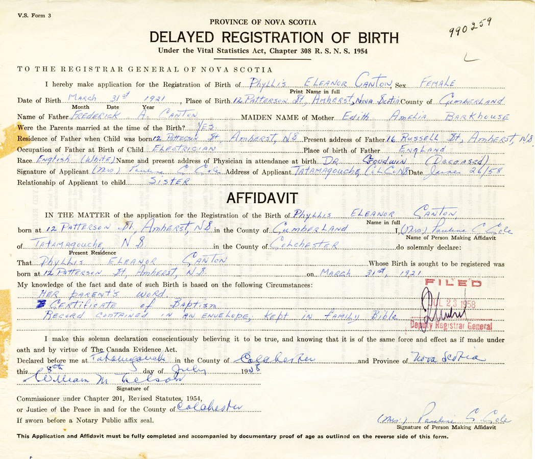 I hereby make application for the Registration of Birth of Phyllis EleanorCanton Sex Female