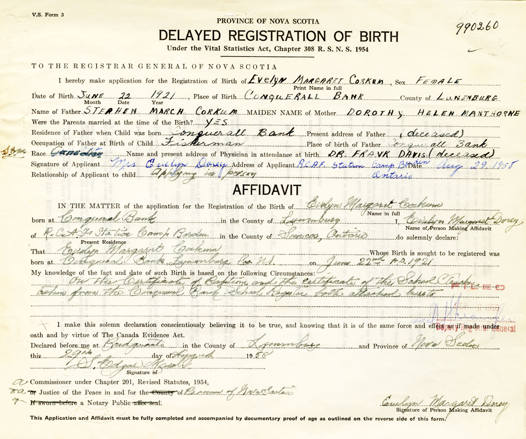 I hereby make application for the Registration of Birth of Evelyn MargaretCorkum Sex Female