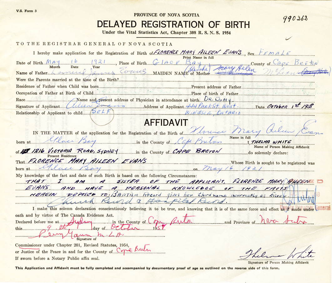 That I am a sister of the applicant, Florence Mary Aileen Evans and have a personal knowledge of the facts herein deposed to. Baptism Record gives her third name incorrectly as Eileen Church Record and Hospital Record