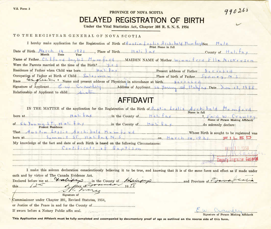 I hereby make application for the Registration of Birth of Austin Leslie ArchibaldMumford Sex Male