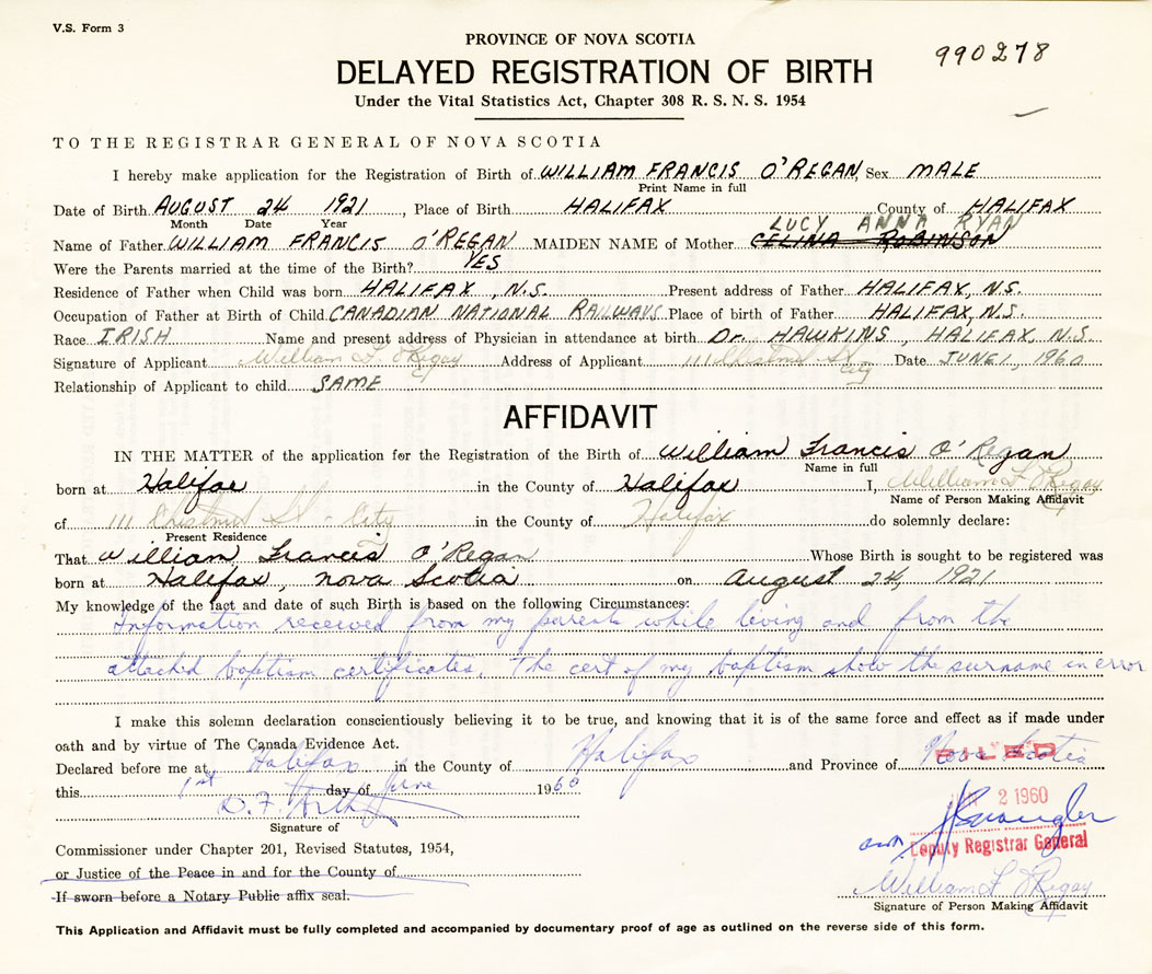 Signature of Applicant William F. O'Regan Address of Applicant 111 Chestnut St. Halifax Date June 1, 1960