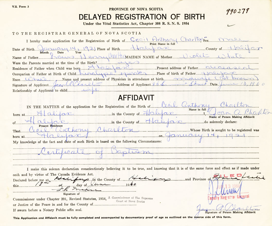 I hereby make application for the Registration of Birth of Cecil AnthonyCharlton Sex Male