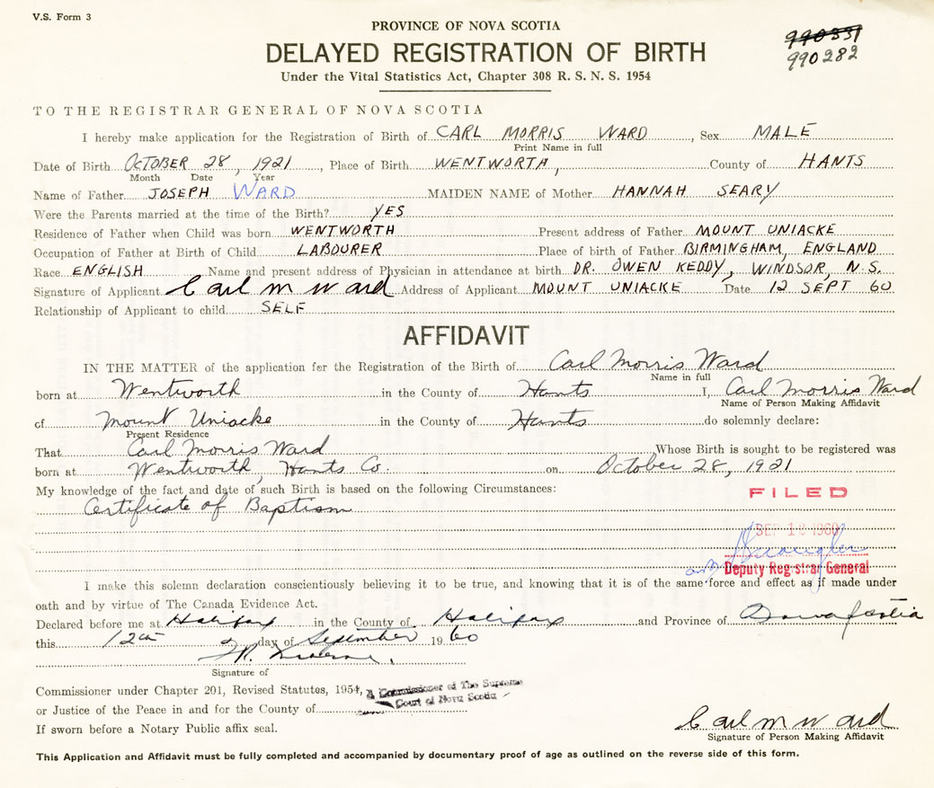 Signature of Applicant Carl M. Ward Address of Applicant Mount Uniacke Date 12 September 1960