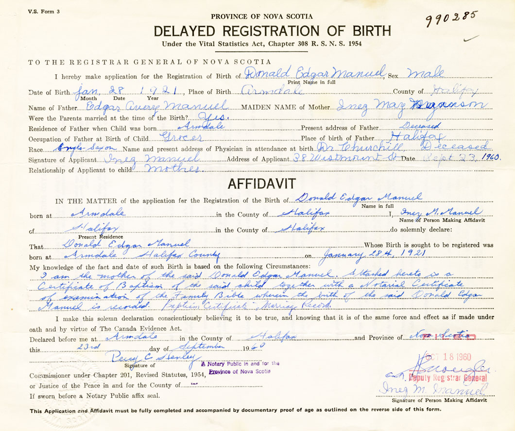 I am the mother of the said Donald Edgar Manuel. Attached hereto is a Certificate of Baptism of the said child together with a National Certificate of examination of the Family Bible wherein the birth of the said Donald Edgar Manuel is recorded. Baptism Certificate, Marriage Record.