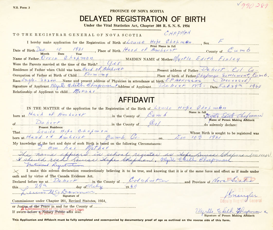 Signature of Applicant Myrtle Edith Chapman Address of Applicant Debert Date February 29, 1960