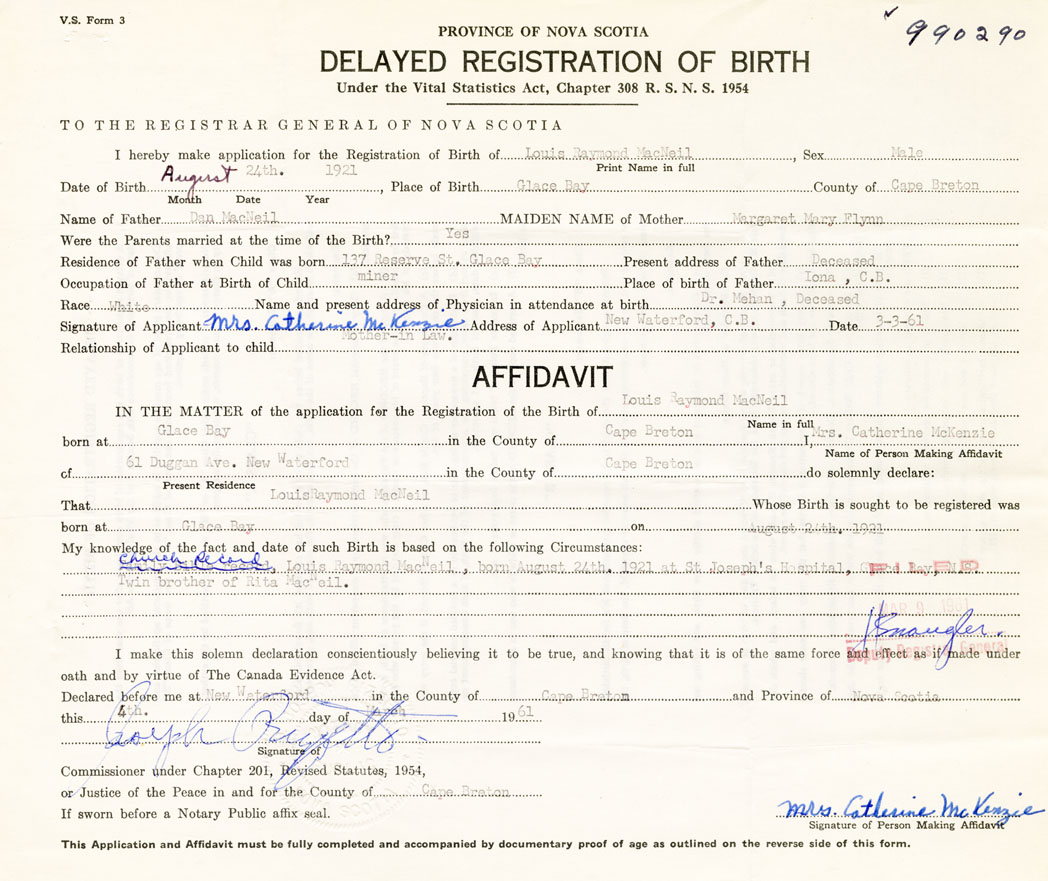 Church Record, Louis Raymond MacNeil, born August 24th, 1921 at St. Josephs Hospital, Glace Bay. Twin brother of Rita MacNeil.