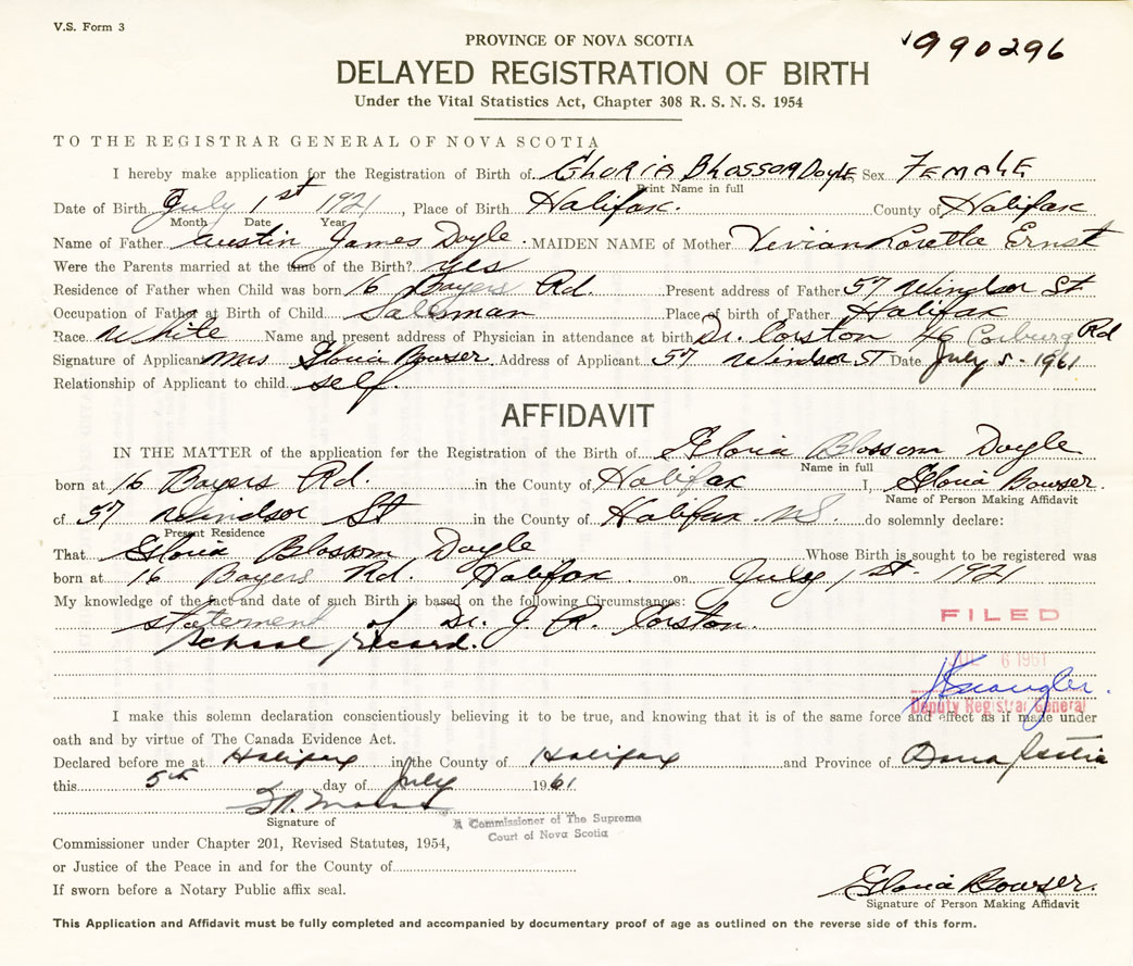 I hereby make application for the Registration of Birth of Gloria BlossomDoyle Sex Female
