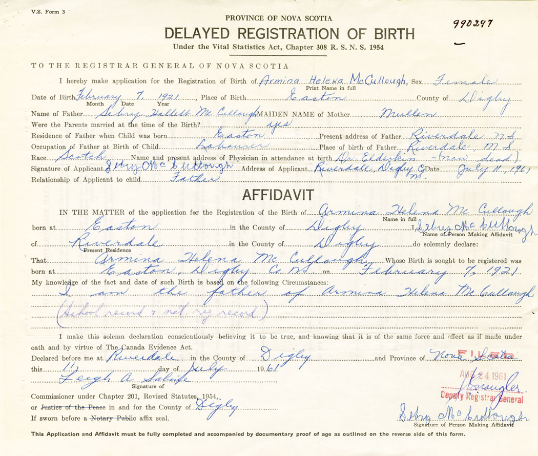 I hereby make application for the Registration of Birth of Armina HelenaMcCullough Sex Female