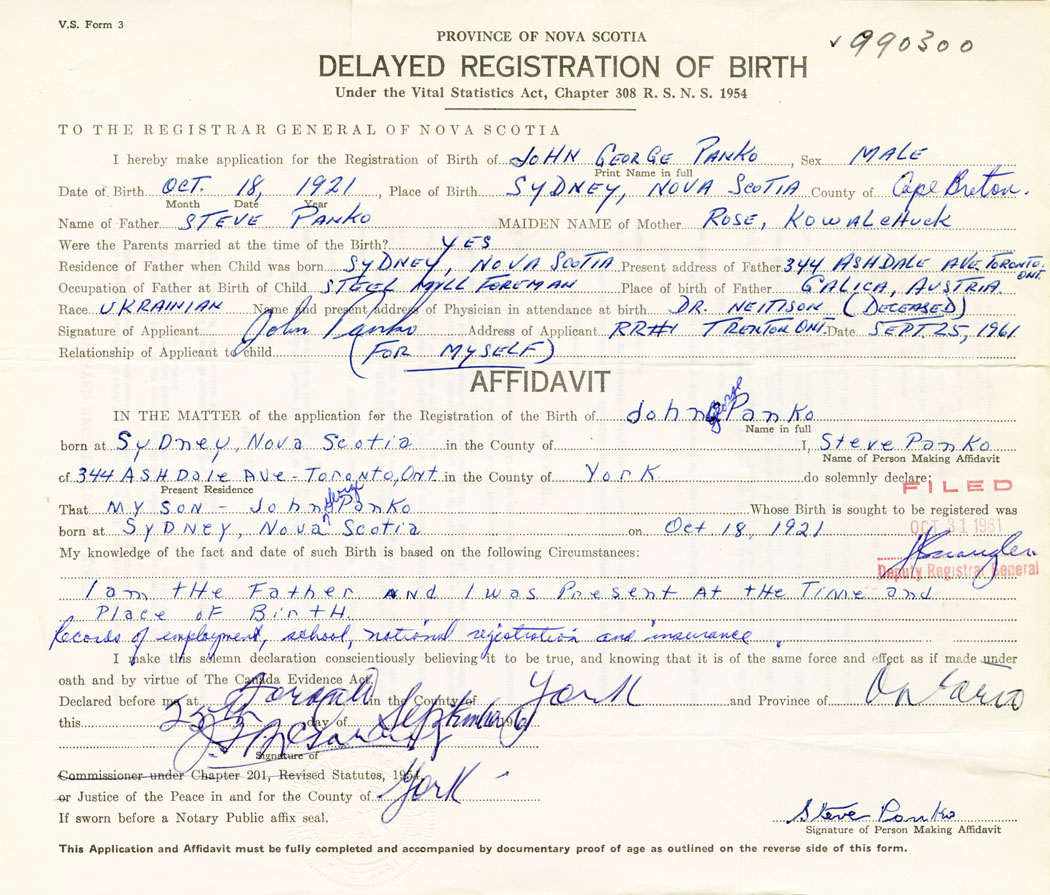 I hereby make application for the Registration of Birth of John GeorgePanko Sex Male