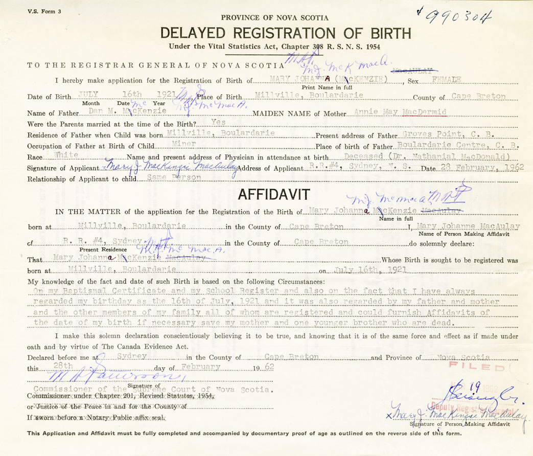 Date of Birth July 16, 1921 Place of Birth Millville, BoulardarieCounty of Cape Breton