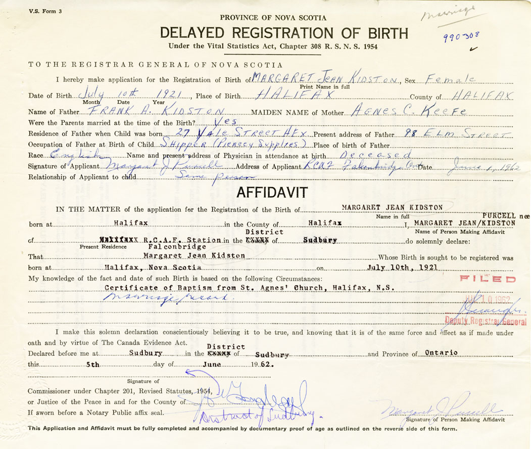 Signature of Applicant Margaret J. Purcell Address of Applicant RCAF Falconbridge, Ontario Date June 1, 1962