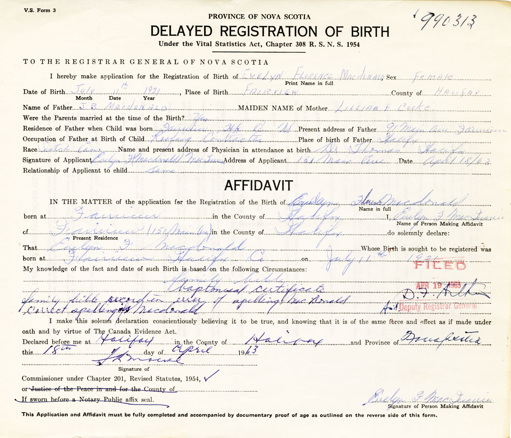 I hereby make application for the Registration of Birth of Evelyn FlorenceMacdonald Sex Female