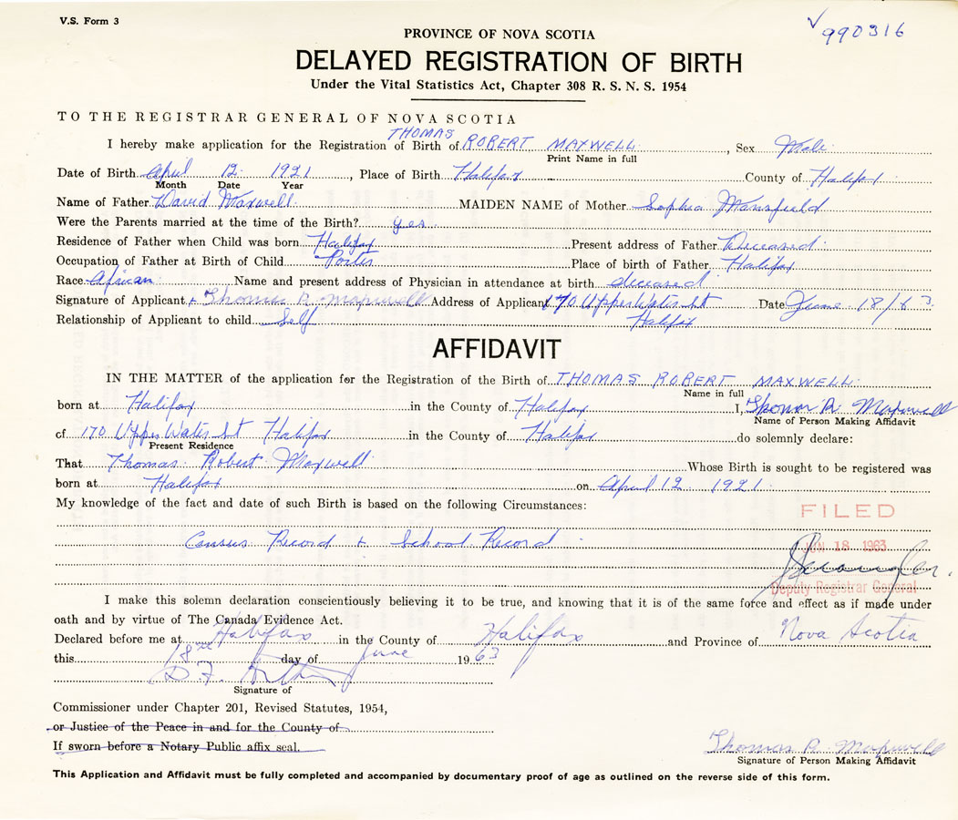 Signature of Applicant Thomas R. Maxwell Address of Applicant 170 Upper Water St. Halifax Date June 18, 1963