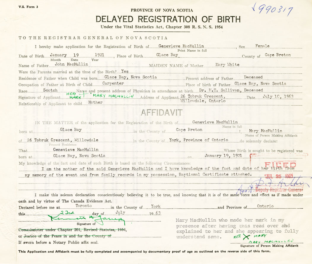 I am the mother of the said Genevieve MacMullin and I have knowledge of the fact and date of her birth from my memory of the event and from family records in my possession, Baptismal Certificate attached.