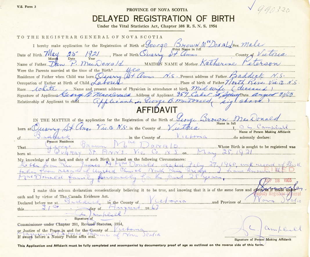 I hereby make application for the Registration of Birth of George BrownMacDonald Sex Male