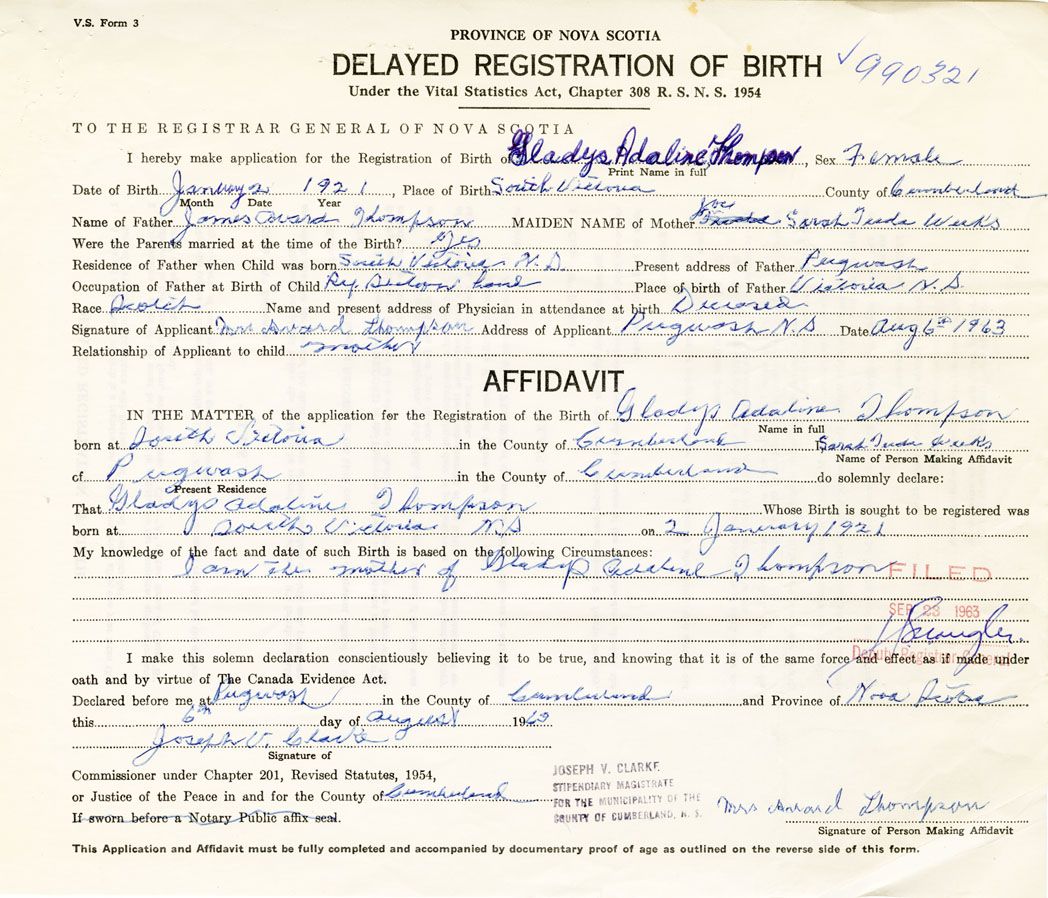 IN THE MATTER of the application for the Registration of the Birth of Gladys AdalineThompson