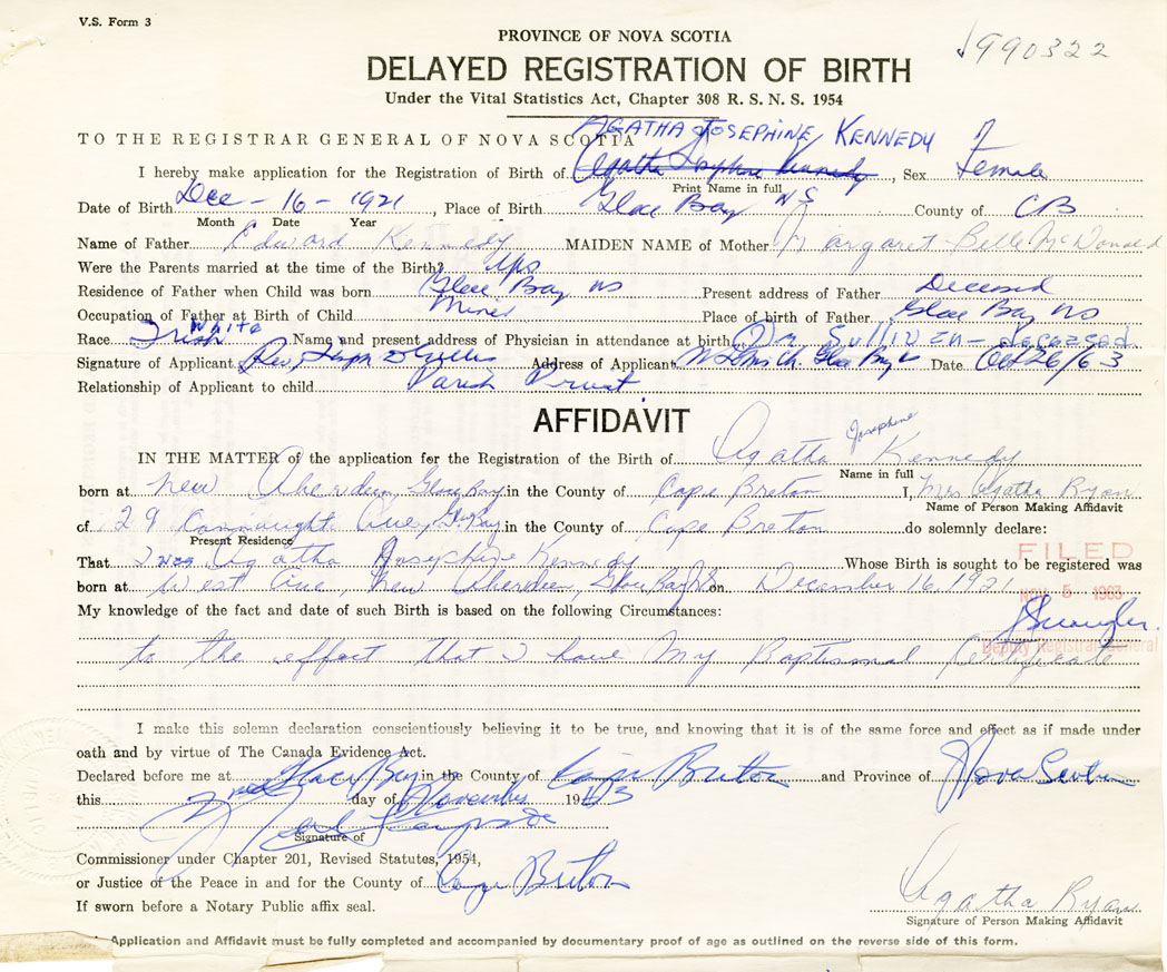I hereby make application for the Registration of Birth of Agatha JosephineKennedy Sex Female