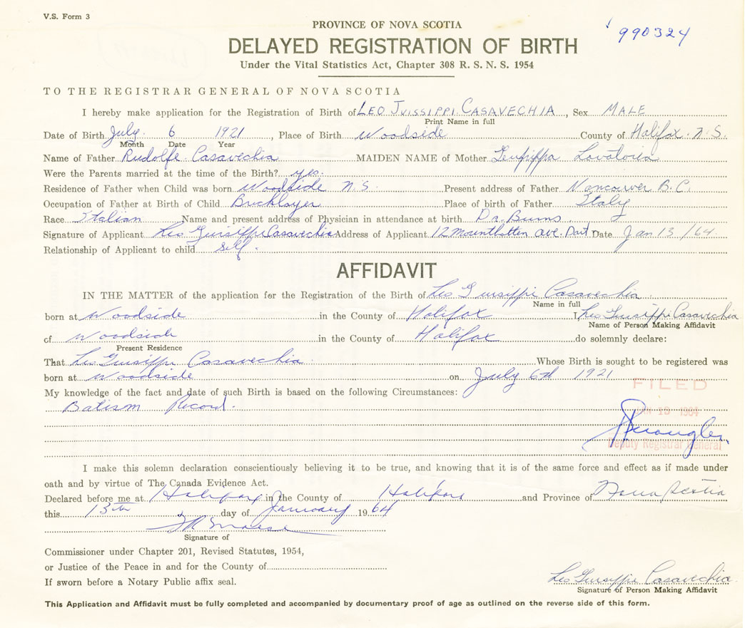 Signature of Applicant Leo Juissippi Casavechia Address of Applicant 12 Mountbatten Ave. Dartmouth Date January 13, 1964