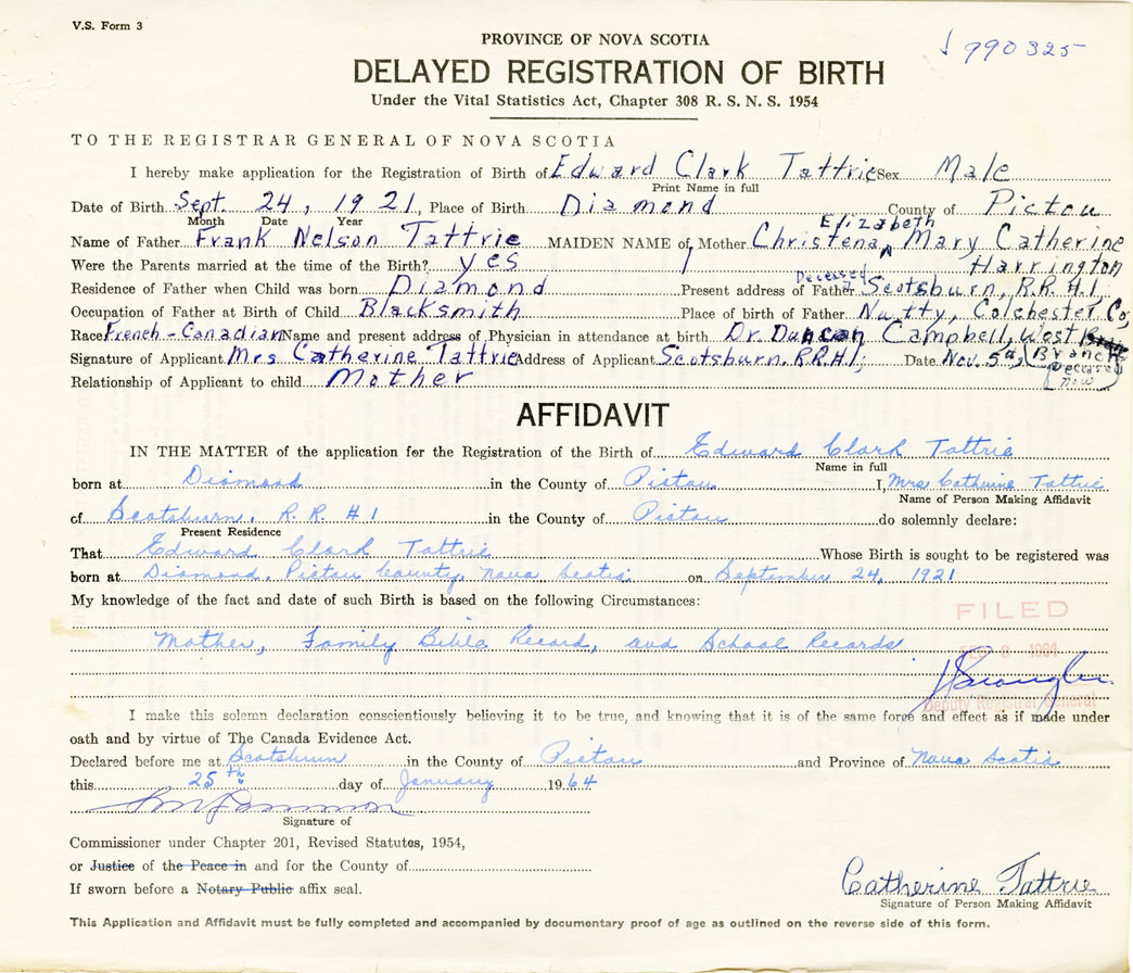 Name of Father Frank Nelson Tattrie MAIDEN NAME of Mother Christena Elizabeth Mary Catherine Harrington