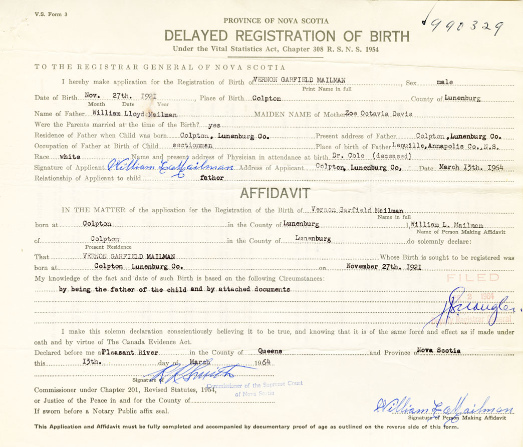 I hereby make application for the Registration of Birth of Vernon GarfieldMailman Sex Male