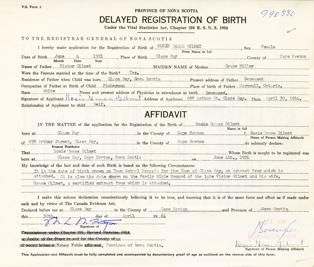 Signature of Applicant Rosie Grace Gilmet Address of Applicant 698 Arthur St. Glace Bay Date April 30, 1964