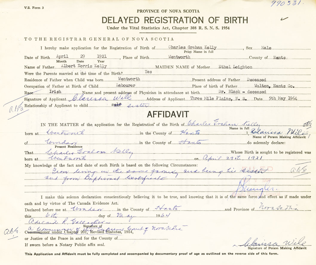 Date of Birth April 29, 1921 Place of Birth WentworthCounty of Hants