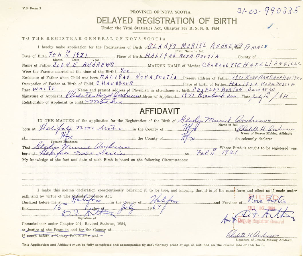I hereby make application for the Registration of Birth of Gladys MurielAndrews Sex Female