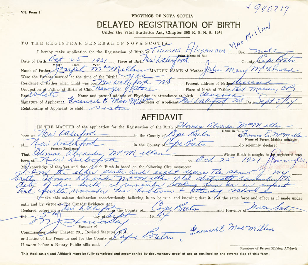 I hereby make application for the Registration of Birth of Thomas AlexanderMacMillan Sex Male