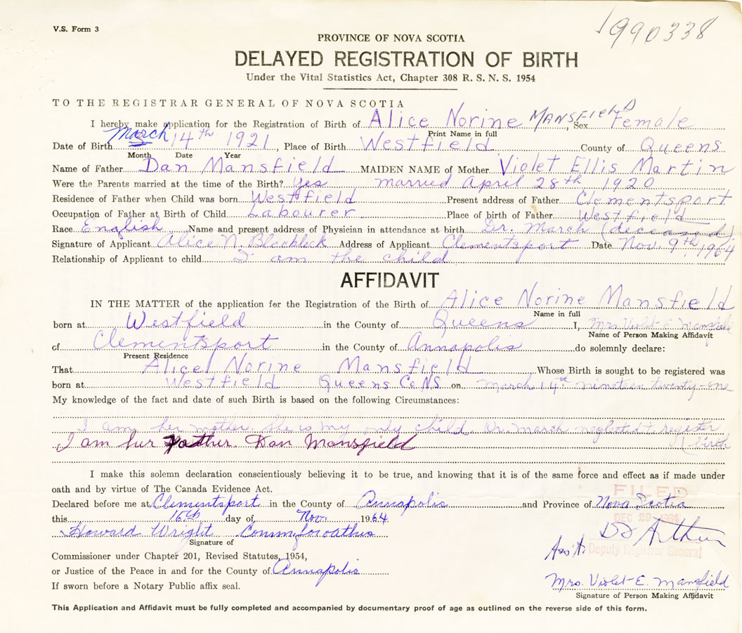 IN THE MATTER of the application for the Registration of the Birth of Alice NorineMansfield