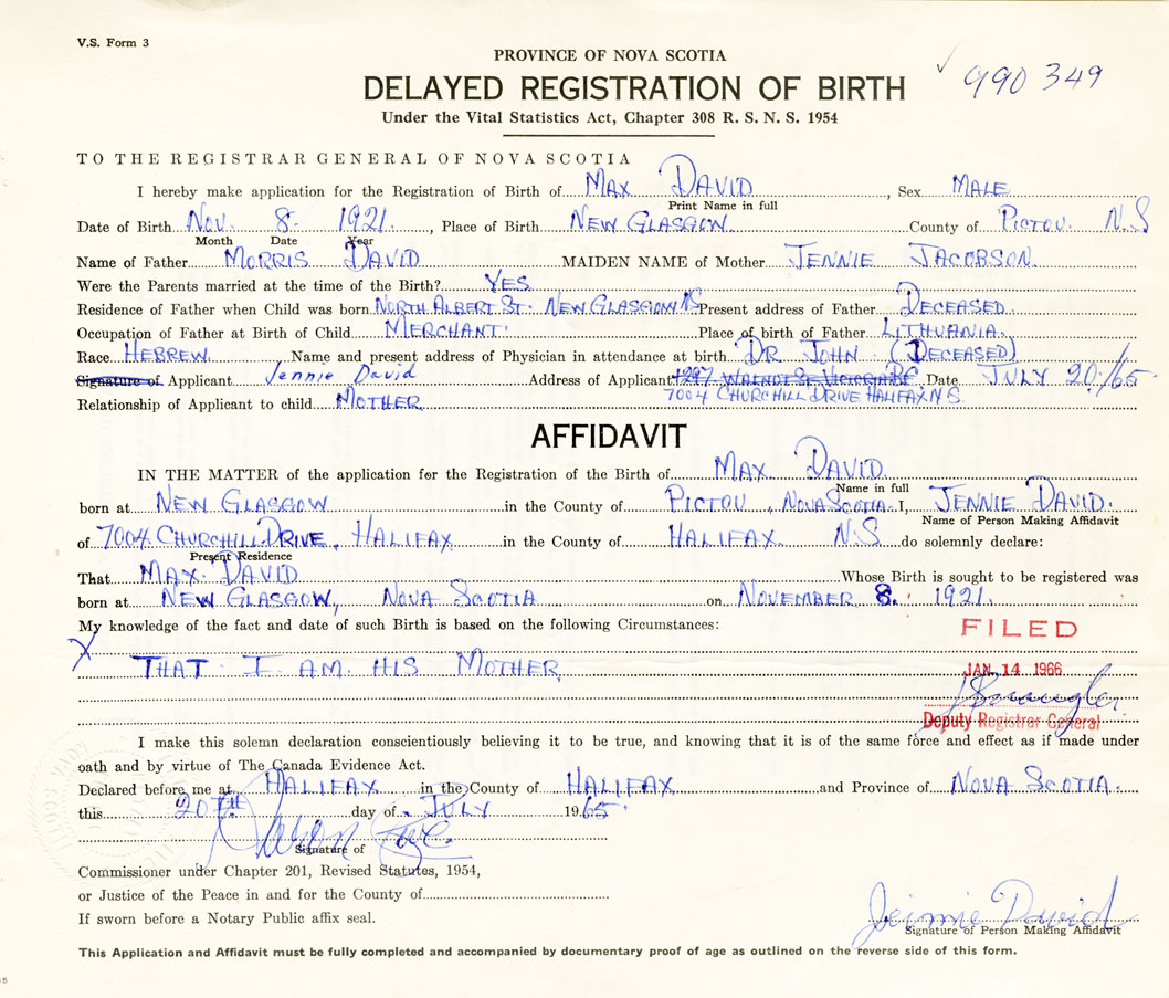 I hereby make application for the Registration of Birth of MaxDavid Sex Male