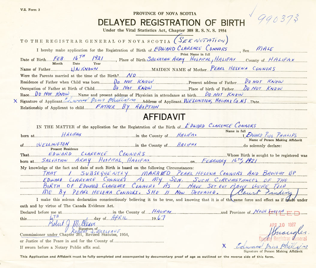 I hereby make application for the Registration of Birth of Edward ClarenceConnors Phillips Sex Male