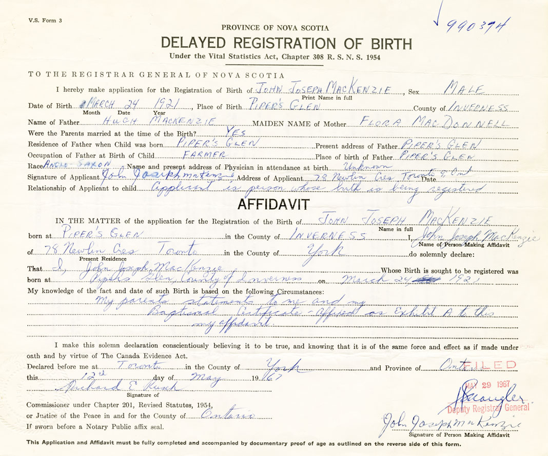 Date of Birth March 24, 1921 Place of Birth Pipers GlenCounty of Inverness
