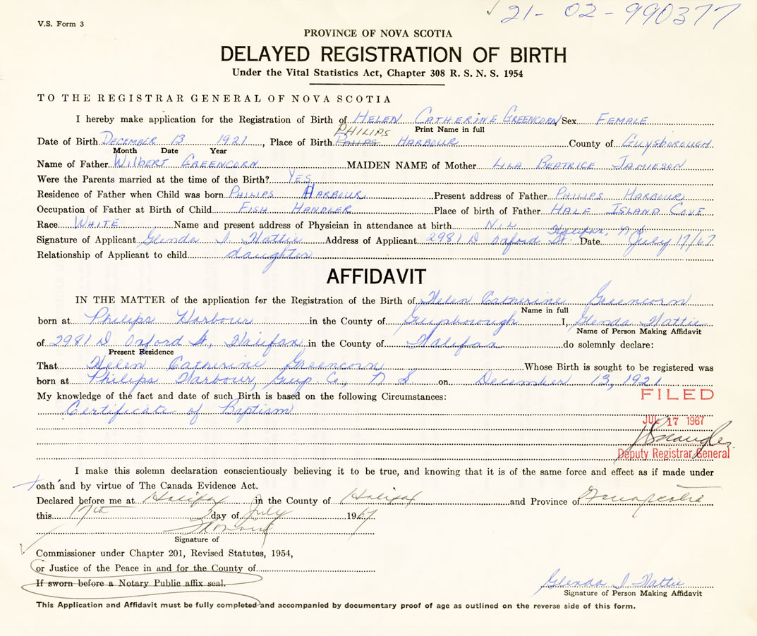 Date of Birth December 13, 1921 Place of Birth Phillips HarbourCounty of Guysborough