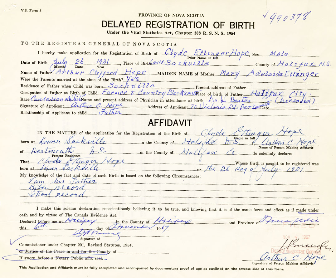 I hereby make application for the Registration of Birth of Clyde EttingerHope Sex Male