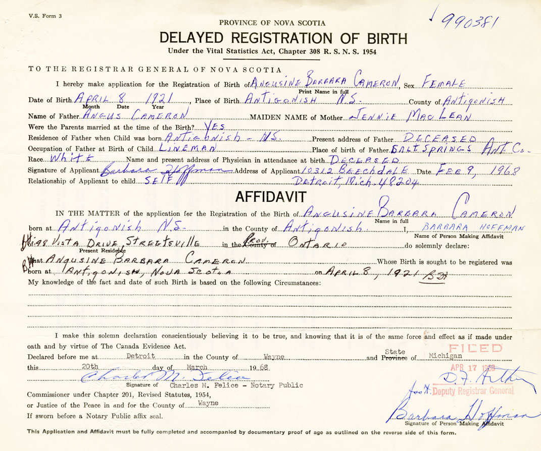 Date of Birth April 8, 1921 Place of Birth AntigonishCounty of Antigonish