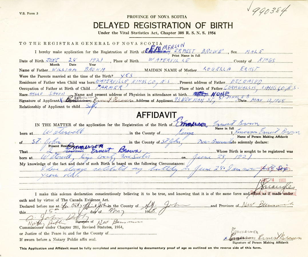 Signature of Applicant Emmerson Ernest Brown Address of Applicant 93 Newman St. St. John, New Brunswick Date 13 May 1968
