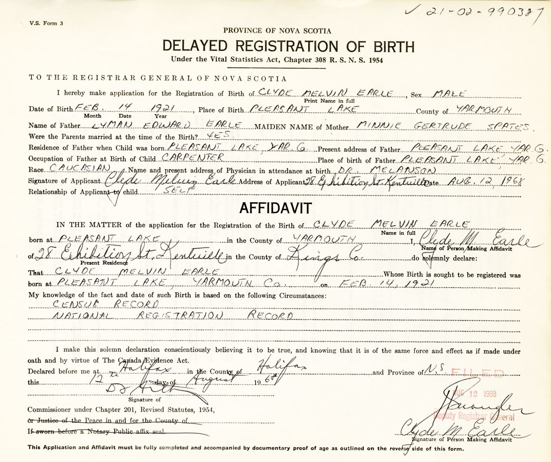 I hereby make application for the Registration of Birth of Clyde MelvinEarle Sex Male