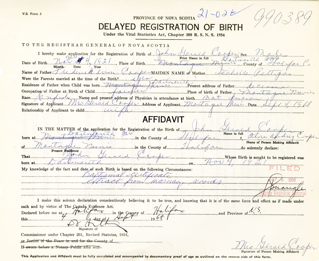 Name of Father Frederick Evan Cooper MAIDEN NAME of Mother Isabelle Pettipas