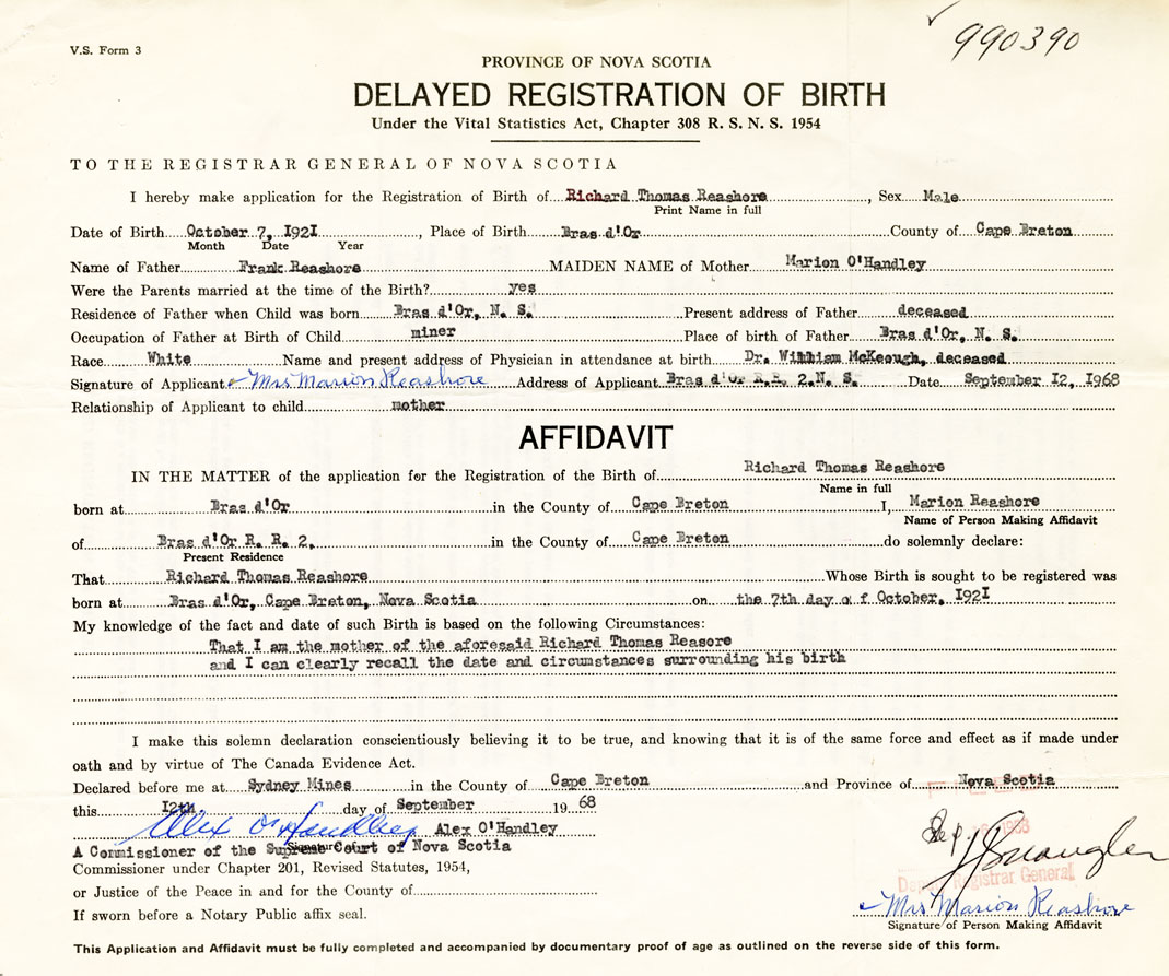 Date of Birth October 7, 1921 Place of Birth Bras d'OrCounty of Cape Breton