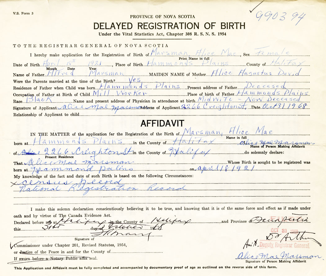 21. Name and Post Office address of Informant Alice Mae Marsman 2266 Creighton St. Halifax
