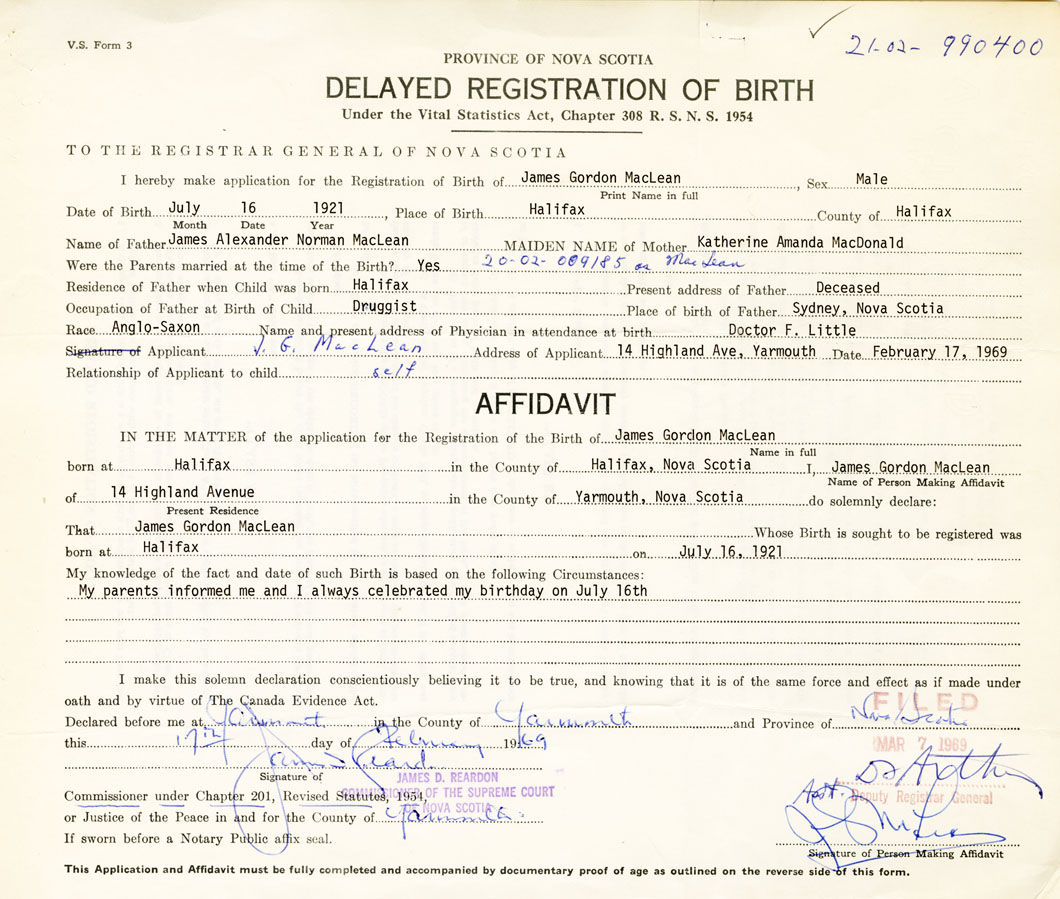 I hereby make application for the Registration of Birth of James GordonMacLean Sex Male