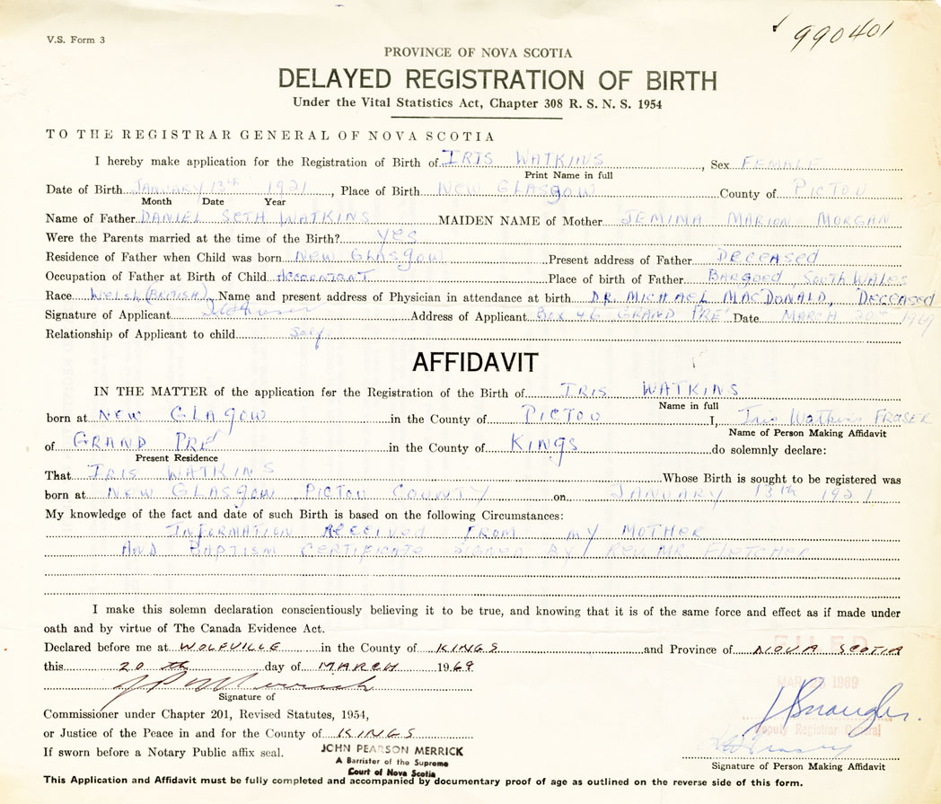 IN THE MATTER of the application for the Registration of the Birth of IrisWatkins