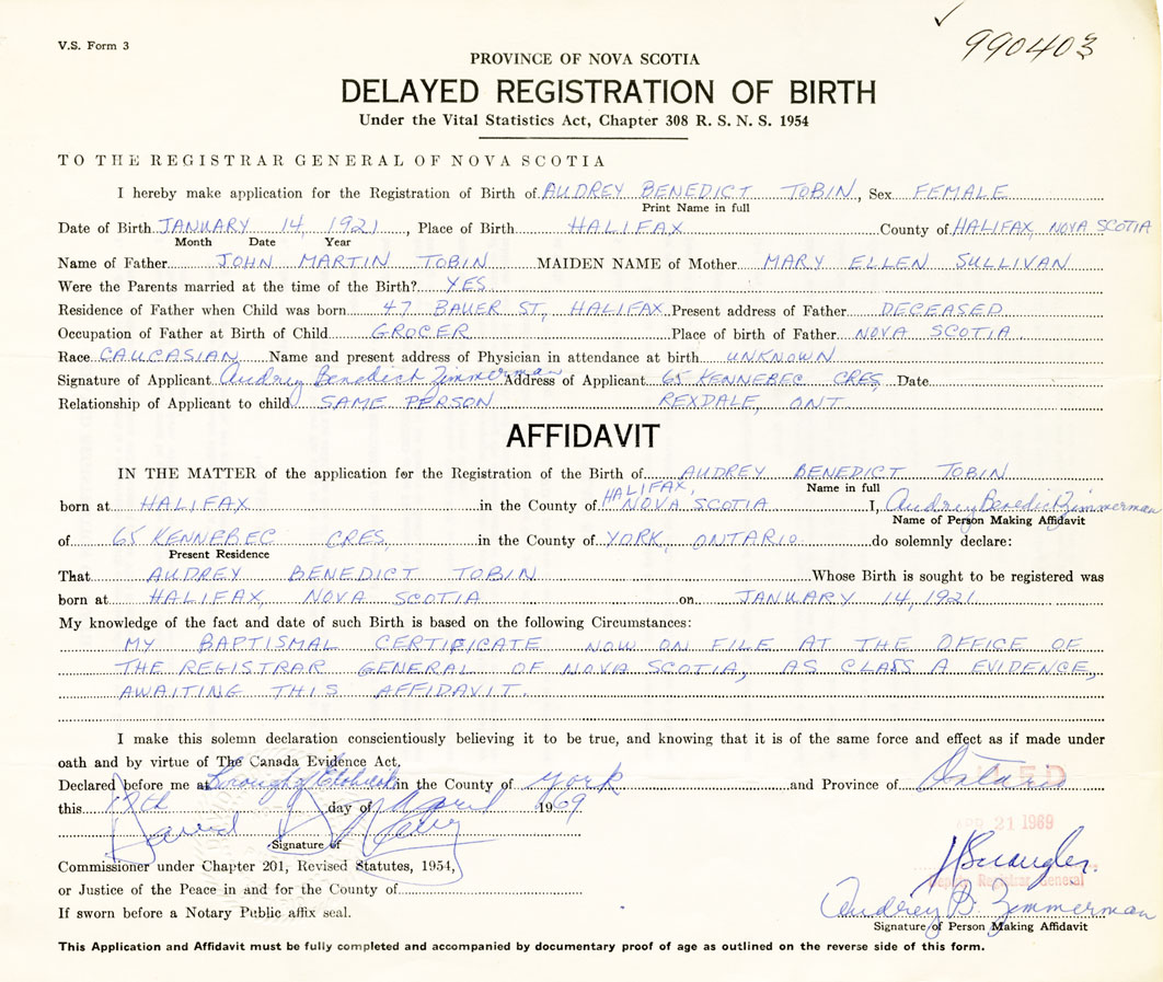 I hereby make application for the Registration of Birth of Audrey BenedictTobin Sex Female