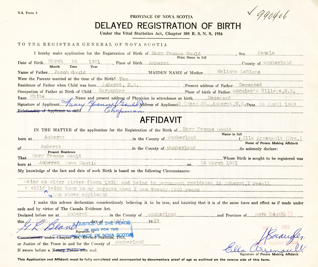 21. Name and Post Office address of Informant Mary Yvonne Gould Chapman 3 Queen St. Amherst