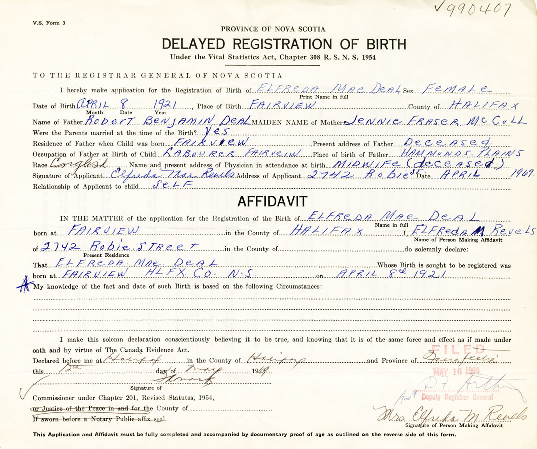 IN THE MATTER of the application for the Registration of the Birth of Elfreda MaeDeal