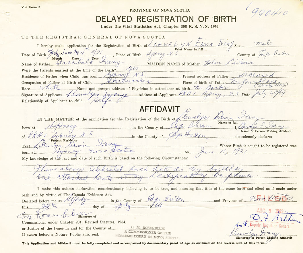 I hereby make application for the Registration of Birth of Llewelyn EdwinIvany Sex Male