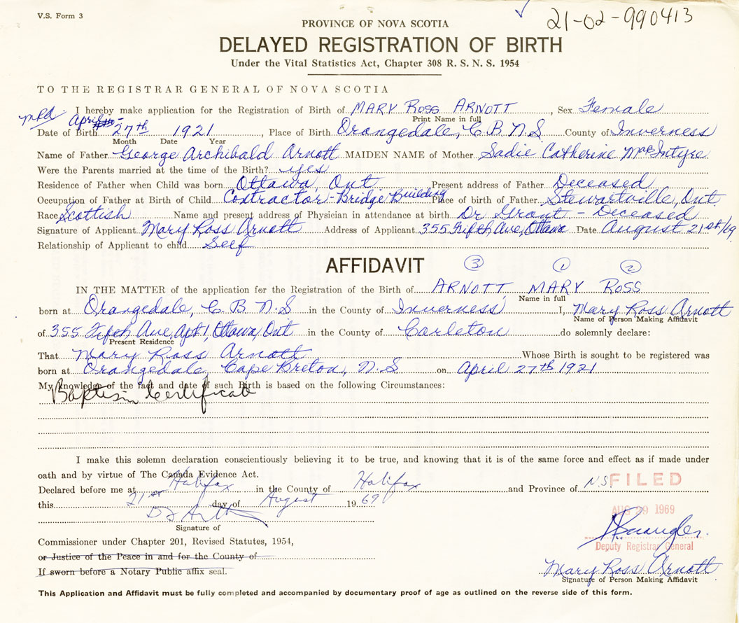 Signature of Applicant Mary Ross Arnott Address of Applicant 355 Fifth Ave. Ottawa, Ontario Date August 21, 1969