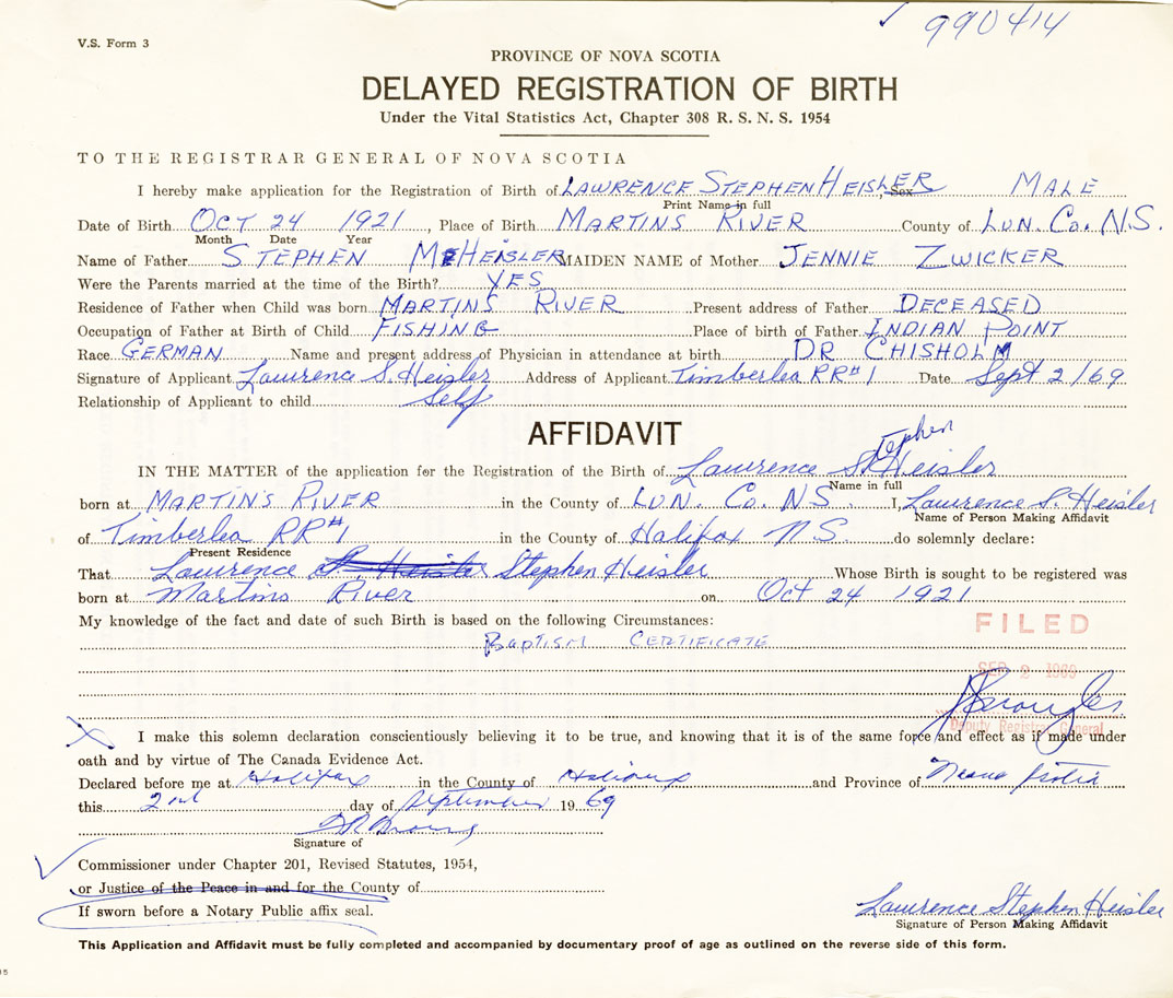 I hereby make application for the Registration of Birth of Lawrence StephenHeisler Sex Male